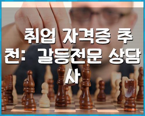 취업 자격증 추천: 갈등전문 상담사 알아 보았습니다. 상기 내용이 찾으셨던분께 좋은 정보가 되셨길 바랍니다.